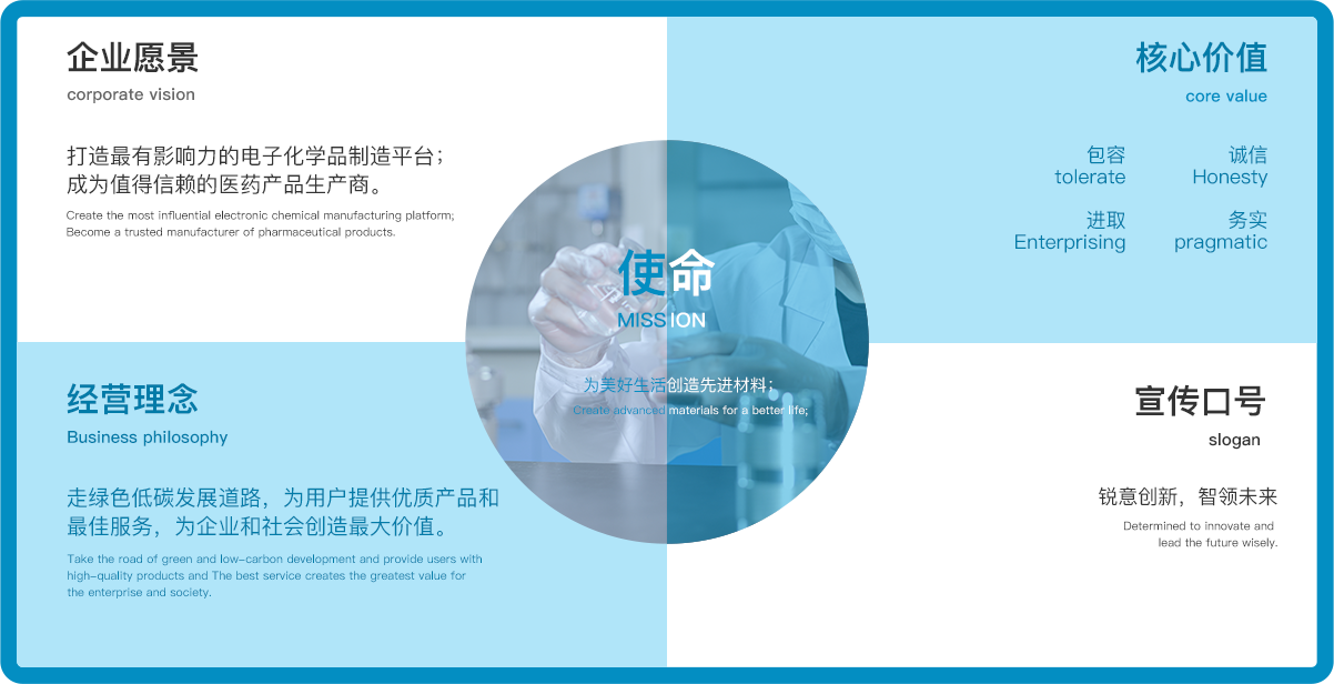 打造最有影響力的電子化學品制造平臺;成為值得信賴的醫藥產品生產商